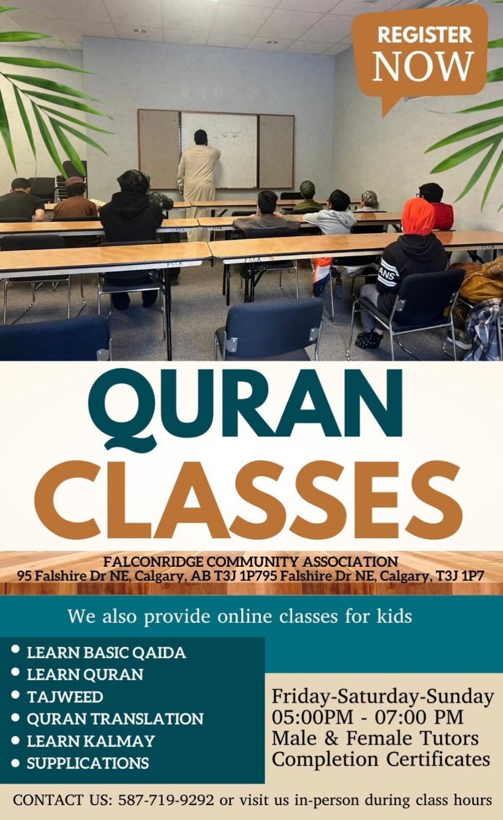 Don’t miss the opportunity to deepen your understanding of the Quran with our engaging classes at the Falconridge Community Association. Classes are held every Friday, Saturday, and Sunday from 5:00 PM to 7:00 PM. Secure your spot by registering today and become part of a vibrant community dedicated to nurturing faith and preserving tradition. Join our WhatsApp group for updates and connect with fellow learners. Call us at 587-717-9292 to register or for more information.